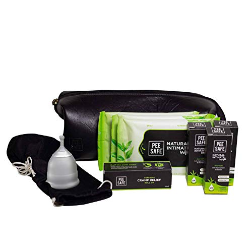 Peesafe Fda Approved Reusable Menstrual Travel Kit - Cups + Intimate Wash + Cramp Relief Roll On - Vegan Leather Kit is available on Amazon.