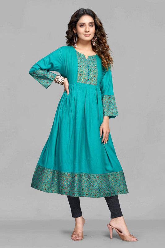 Maiyee Women Printed Flared Kurta(Green) is available on Flipkart.