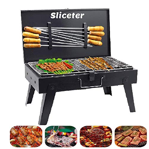 - This barbeque grill is extremely easy to assemble as well as clean. Thanks to its detachable legs and portable case, this coal-based Barbeque grill can be easily carried along while you go on picnic. Sliceter Barbeque grill comes with a removable tray with a handle .Pierce your favourite vegetables or meat with the skewers and place them a top the barbecue station to cook them with the charcoal. You can use all skewers or fewer, depending on your needs.