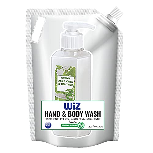 Wiz Hand & Body Wash 2In1 Refill, Crème Aloe Vera & Almond Extract, Tea Tree 1.5L, Paraben Free, Germ Fighter, Moisturiser is available on Amazon.